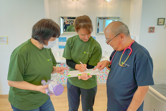 シンフォニーでは、一人の利用者に対して原則一人以上でケアをするようにしています。スタッフに仕事の負担が偏らないように役割分担もしっかり行い、誰かに仕事が集中していないか見えやすい体制にしています。